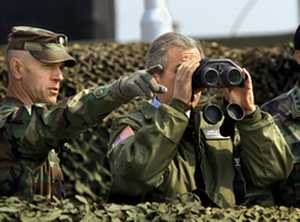 布什視察都羅山車站 稱南北鐵路是和平之路(圖) 2002年02月20日 14:41 ![]() 布什在非軍事區(qū)用望遠鏡觀望朝鮮一側(cè)(美聯(lián)社) 中新網(wǎng)北京2月20日消息:韓國總統(tǒng)金大中和來訪的美國總統(tǒng)布什今天視察都羅山車站。這個車站是金大中希望連接平壤和漢城的鐵路線的北終點站。 據(jù)韓國聯(lián)合新聞社報道,金大中希望借此舉來敦促朝鮮對恢復對話的呼吁作出回應。 在上午的首腦會談中,兩國總統(tǒng)就聽取了這項連接南北的鐵路工程的進度情況簡報。 在舉行聯(lián)合記者招待會后,布什乘直升飛機花費二十分鐘抵達非軍事區(qū)。這個二點五英里寬,一百五十一英里長的區(qū)域布滿地雷,分界線兩側(cè)駐扎著將近朝韓兩百萬軍隊。 美國在韓國保持有三萬七千人的駐軍。布什在抵達時向一名指揮官威廉·米勒中校敬禮致意。 布什在都羅山車站發(fā)表講話。他說:“我們今天相聚在這里,周圍是朝鮮半島和平與穩(wěn)定受到挑戰(zhàn)時的遺跡。金大中總統(tǒng)剛才向我介紹了一條他修建的道路--一條和平之路。” 據(jù)路透社報道,布什敦促朝鮮對韓國開放邊境。他說:“這條鐵路可能將這塊分裂的土地兩側(cè)的人民帶到一起來。為了朝鮮半島全體人民的福祉,朝鮮應該完成它! 布什在非軍事區(qū)的講話強硬的措詞中也顯示出靈活性。他甚至在談及朝鮮時仍使用了“邪惡”這個字眼,但他同時也重申了朝鮮對話的建議。 在一個觀察哨所里,布什身穿一件手臂上繡有美國國旗的綠色軍用夾克,通過雙筒望遠鏡從壘著沙袋的地堡內(nèi)觀察朝鮮一側(cè)。