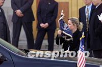 ![]() 美國(guó)總統(tǒng)布什與夫人二十一日上午抵達(dá)北京首都國(guó)際機(jī)場(chǎng),開(kāi)始為期兩天的工作訪問(wèn)。中新社圖 毛建軍 攝 ![]() 美國(guó)白宮工作人員二十一日在北京首都國(guó)際機(jī)場(chǎng)為美國(guó)總統(tǒng)布什座駕安裝旗幟。中新社記者 毛建軍 攝