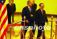 中新社北京二月二十一日電 題:江澤民主席主持儀式歡迎布什總統(tǒng) 中新社記者 朱大強(qiáng) 早春二月,美國(guó)總統(tǒng)喬治·沃克·布什來(lái)到北京,來(lái)到人民大會(huì)堂,受到中國(guó)國(guó)家主席江澤民的熱烈歡迎。 今天的大會(huì)堂北大廳,地上鋪著紅地毯,莊嚴(yán)的五星紅旗和星條旗分別豎立在檢閱臺(tái)兩側(cè),威武的三軍儀仗隊(duì)正面排列、記者們的攝像和攝影鏡頭調(diào)準(zhǔn)焦距…… 上午十一時(shí),江澤民和夫人王冶坪在大會(huì)堂北大廳門口歡迎布什和夫人勞拉。兩國(guó)元首熱烈握手,這是自去年十月他們?cè)谏虾?huì)晤四個(gè)月后首次在北京見面。 布什總統(tǒng)身著深色西裝,系著蘭色領(lǐng)帶,春風(fēng)得意。 在相互介紹雙方參加歡迎儀式主要官員后,江澤民主席與布什總統(tǒng)走上檢閱臺(tái)本國(guó)國(guó)旗一側(cè),江澤民主席夫人王冶坪和布什總統(tǒng)夫人勞拉站立其后。軍樂(lè)隊(duì)奏響美國(guó)國(guó)歌和中國(guó)國(guó)歌。之后,布什總統(tǒng)在江澤民主席的陪同下,檢閱儀仗隊(duì),當(dāng)走到中國(guó)人民解放軍軍旗前時(shí),布什立正向軍旗行注目禮。 訪問(wèn)北京是布什時(shí)隔二十多年后故地重游。上個(gè)世紀(jì)七十年代中期,布什的父親老布什出使中國(guó)時(shí),他曾來(lái)北京探望過(guò)父母。所以,布什對(duì)北京并不生疏,所不同的是北京的發(fā)展太快了。 更有新意的是今天巧為尼克松總統(tǒng)三十年前訪華紀(jì)念日,作為第五十四屆美國(guó)總統(tǒng),布什踏著尼克松、老布什的足跡訪問(wèn)中國(guó),使命重大。布什說(shuō):中國(guó)是一個(gè)偉大的國(guó)家,美國(guó)必須努力與中國(guó)發(fā)展良好、真誠(chéng)的關(guān)系。 這是一個(gè)重要契機(jī),此次江澤民主席與布什總統(tǒng)的會(huì)晤,將明確宣示中美兩國(guó)保持和擴(kuò)大的合作領(lǐng)域,取得多方面的積極成果。 十分鐘的歡迎儀式結(jié)束了。在軍樂(lè)聲中,踏著中國(guó)的紅地毯,江澤民主席與布什總統(tǒng)像老朋友一樣,邊走邊交談著,走向會(huì)談廳。