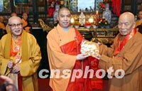 圖:兩岸佛教人士互贈送禮品 2002年02月22日 13:56 ![]() 在西安參加法門寺佛指舍利赴臺灣地區(qū)瞻禮(供奉)活動的兩岸佛教人士,二十二日上午來到西安大慈恩寺參觀,該寺方丈增勒法師向臺灣佛教人士贈送禮品。中新社記者 錢興強(qiáng) 攝