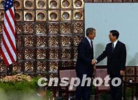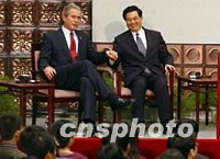 ![]() 中國國家副主席胡錦濤二十二日在北京清華大學聆聽訪華的美國總統(tǒng)布什演講。中新社記者 賈國榮 攝