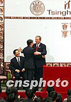 組圖:布什在清華演講 2002年02月22日 14:12 ![]() 訪(fǎng)華的美國(guó)總統(tǒng)布什二十二日在北京清華大學(xué)發(fā)表演講。中新社記者 賈國(guó)榮 攝 ![]() 美國(guó)總統(tǒng)布什二十二日在北京清華大學(xué)發(fā)表演講后下臺(tái)時(shí),踩在臺(tái)階上身體搖晃了一下,他馬上和校長(zhǎng)張開(kāi)雙臂好似保護(hù)動(dòng)作般開(kāi)玩笑。中新社記者 賈國(guó)榮 攝