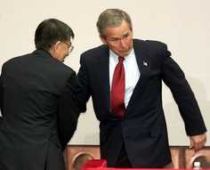 幽默和尷尬——外電報道布什訪華過程花絮(圖) 2002年02月22日 17:08 ![]() 清華校長王大中扶住差點絆倒的布什(美聯(lián)社) 中新網(wǎng)北京2月22日消息:布什對中國的訪問在坦誠和熱情的氣氛中進(jìn)行,兩國領(lǐng)導(dǎo)人就中美關(guān)系和國際形勢等重大問題進(jìn)行了重要的會談,而訪問過程中也出現(xiàn)了一些有趣的花絮。 布什遇上兩次小麻煩 據(jù)德新社報道,今天布什座車的輪胎在赴宴途中爆裂,迫使他換乘后面的車輛。當(dāng)時他剛結(jié)束在清華大學(xué)的演講,正趕往北京市中心的中南海與江澤民主席共進(jìn)午餐。布什被迫放棄自己的豪華轎車,但是沒有延誤他與江主席的會晤。爆胎是美國總統(tǒng)今天遇上的第二次尷尬。 此前,布什在清華大學(xué)的演講贏得了兩三百名學(xué)生的熱烈掌聲,但是提問環(huán)節(jié)結(jié)束后,他在走過講臺準(zhǔn)備與中國官員握手時腳底絆了一下。布什顯然試圖化解這一尷尬場面,順勢做了要與一名中國官員擁抱的樣子。 清華演講不乏幽默 美國的《紐約時報》的報道說,布什在中國高等學(xué)府清華大學(xué)的演說時有幽默之處。在提問環(huán)節(jié),布什的中文譯員最開始居然準(zhǔn)備把總統(tǒng)的回答翻譯成她自己“出色”的英語。布什笑著說:“她在糾正我的英語! 還有一次,一名學(xué)生問布什是否鼓勵自己的雙胞胎女兒來中國學(xué)習(xí)。布什再次笑答:“恐怕她們不再聽我的話啦,如果你明白我的意思的話!