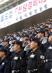 韓國警方成立“世界杯安全警備隊(duì)”保持治安 2002年03月21日 08:28 ![]() 韓國世界杯安全警備隊(duì)枕戈待旦,全力為世界杯保駕護(hù)航(圖據(jù)韓國中央日報(bào)) 中新網(wǎng)北京3月21日消息:承辦世界杯賽事的漢城、光州、蔚山昨天分別成立了專門負(fù)責(zé)安全事務(wù)的“世界杯安全警備隊(duì)”,以為即將到來的世界杯安全保障做準(zhǔn)備。 據(jù)悉,韓國出動的警備隊(duì)員都是具有警衛(wèi)經(jīng)驗(yàn)或是精通外語的警察。其中,漢城警備隊(duì)的人數(shù)為9000人,光州為3000人,蔚山為2590人。 在世界杯期間,這些“安全警備隊(duì)員”將被分配在球場、機(jī)場、參賽隊(duì)的住宿設(shè)施以及新聞中心等地,從事維護(hù)交通秩序和人員安全以及反恐等21個(gè)領(lǐng)域的安全活動。
