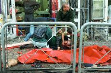 耶路撒冷發(fā)生自殺炸彈襲擊 至少兩人死亡(圖) 2002年03月21日 23:29 ![]() 一名傷者在死者遺體邊接受急救 中新網(wǎng)北京3月21日消息:耶路撒冷市中心今天發(fā)生自殺性炸彈襲擊,造成至少兩人死亡,另有四十人受傷。此事對(duì)美國(guó)推動(dòng)中東和平進(jìn)程的努力無(wú)疑又構(gòu)成沉重打擊。 當(dāng)?shù)鼐秸f(shuō),事件發(fā)生在當(dāng)?shù)貢r(shí)間21日下午4時(shí)25分左右。出事地點(diǎn)靠近最近發(fā)生的多起槍擊與炸彈襲擊地區(qū)。 目擊者說(shuō),多輛救傷車在事發(fā)后趕到現(xiàn)場(chǎng)并載走許多傷者,警方已封鎖現(xiàn)場(chǎng),方便進(jìn)行救人的工作。 據(jù)以色列電臺(tái)報(bào)道,初步報(bào)告指出,有7名傷者的傷勢(shì)相當(dāng)嚴(yán)重。