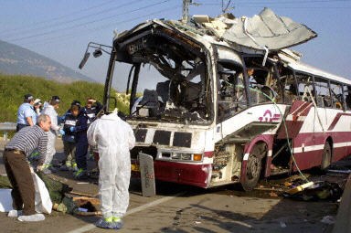 圖:以色列海法市公車被炸彈襲擊造成10人死亡 2002年04月10日 16:10 ![]() 今天在以色列北部城市海法的公車自殺炸彈襲擊事件中,至少有10人死亡,另有20人受傷。法新圖