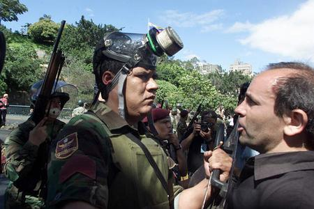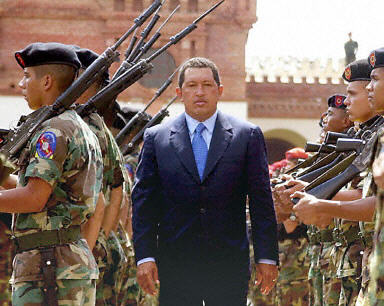 委內(nèi)瑞拉將領(lǐng)稱總統(tǒng)失去權(quán)力 軍隊(duì)控制國(guó)家(圖) 2002年04月12日 10:40 委內(nèi)瑞拉10名高級(jí)軍官11日發(fā)表聲明,要求總統(tǒng)查韋斯下臺(tái).圖為2002年2月4日委內(nèi)瑞拉總統(tǒng)在首都加拉加斯檢閱軍隊(duì)。法新圖