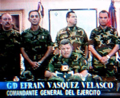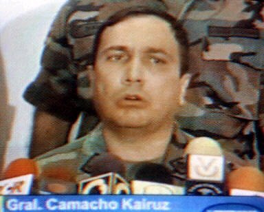 ![]() 委內(nèi)瑞拉當(dāng)?shù)貢r間4月11日晚(北京時間12日上午),國民警衛(wèi)隊的卡伊魯茲將軍在當(dāng)?shù)仉娨暸_宣布,總統(tǒng)查韋斯的政府已經(jīng)“不再履行其職能”,全國局勢已經(jīng)被軍隊控制。圖為卡伊魯茲將軍在電視臺講話時的電視截頻圖像。(春風(fēng))