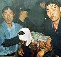 圖:滿身鮮血纏滿繃帶的乘客被送往醫(yī)院 2002年04月15日 17:21 ![]() ![]() 在韓國(guó)釜山附近金海機(jī)場(chǎng)撞山墜毀的中國(guó)航班上至少有54名生還者。圖為數(shù)名滿身鮮血和纏滿繃帶的乘客被救援人員背著送往醫(yī)院。直升機(jī)和救援車輛無(wú)法進(jìn)入現(xiàn)場(chǎng)。