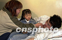 圖:四一五空難中國(guó)幸存者與家屬相會(huì) 2002年04月20日 19:00 ![]() 四·一五空難中國(guó)幸存者的家屬20日終于見(jiàn)到了躺在韓國(guó)醫(yī)院里的親人,生死相逢,熱淚盈盈。圖為幸存者金文學(xué)與妻子、女兒見(jiàn)面時(shí)的歡樂(lè)場(chǎng)面。作者:陶光雄