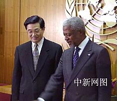 圖:胡錦濤與聯(lián)合國秘書長安南會晤 2002年04月30日 08:42 ![]() 美國東部時間四月二十九日下午,中國國家副主席胡錦濤一行在首次對美國進行正式訪問期間,來到紐約聯(lián)合國總部,與聯(lián)合國秘書長安南會晤。中新社記者 陳建 攝