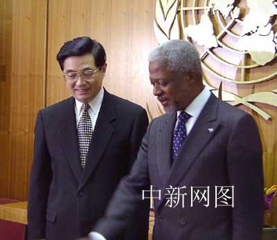 常駐聯(lián)合國大使王英凡的陪同下參觀聯(lián)合國總部。中新社記者 陳建 攝 中新網(wǎng)聯(lián)合國四月二十九日電(記者趙海燕、陳建)今天下午,中國國家副主席胡錦濤在紐約聯(lián)合國總部會見聯(lián)合國秘書長安南時指出,在當(dāng)前復(fù)雜多變的國際形勢下,聯(lián)合國肩負(fù)的任務(wù)更加艱巨,其作用只能加強(qiáng),不能削弱;其權(quán)威只能維護(hù),不能損害。 胡錦濤說,聯(lián)合國成立以來,為解決地區(qū)沖突,促進(jìn)世界和平、合作與發(fā)展,做了許多有益的工作,發(fā)揮著不可替代的作用。他強(qiáng)調(diào),中國作為安理會常任理事國,將繼續(xù)積極參與聯(lián)合國事務(wù),支持和配合秘書長的工作。 安南向胡錦濤通報了關(guān)于中東、伊拉克等問題的最新進(jìn)展情況。 關(guān)于中東問題,雙方都認(rèn)為,國際社會應(yīng)繼續(xù)敦促以巴雙方盡早結(jié)束以暴制暴的惡性循環(huán),政治解決中東問題是唯一可行的途徑。 在談到伊拉克武器核查問題時,胡錦濤高度評價聯(lián)合國為尋求該問題解決所做的努力,他說,世界上大多數(shù)國家都希望政治解決伊拉克問題,不希望看到伊拉克問題而引發(fā)中東和海灣局勢的進(jìn)一步復(fù)雜和動蕩。 安南高度贊揚(yáng)中國現(xiàn)代化建設(shè)所取得的巨大成就,感謝中國對發(fā)展同非洲等發(fā)展中國家友好互利合作的一貫重視以及對聯(lián)合國工作的堅定支持。 當(dāng)天下午,胡錦濤還會見了美國前國務(wù)卿基辛格博士,雙方就中美關(guān)系等問題交換了意見。(完)