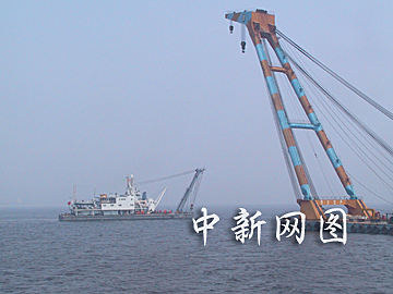 ![]() 有關部門出動巨型起吊設備打撈五七空難失事客機機頭。中新社記者 王麗南 攝