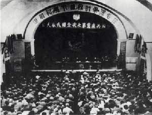 圖文:中國共產(chǎn)黨第七次全國代表大會簡介 2002年05月14日 17:10 ![]() 圖為七大會場 1945年4月23日至6月11日,中國共產(chǎn)黨第七次全國代表大會在延安楊家?guī)X中央大禮堂召開,歷時50天。出席大會的正式代表547名,候補代表208名,共計755名,代表全國121萬黨員。大會選出毛澤東、朱德、劉少奇、周恩來、任弼時、林伯渠、彭德懷、康生、陳云、陳毅、賀龍、徐向前、高崗、張聞天、彭真15人組成主席團(tuán),選舉任弼時為大會秘書長、李富春為副秘書長。 大會的主要議程是:毛澤東作《論聯(lián)合政府》的政治報告;劉少奇作《關(guān)于修改黨的章程的報告》;朱德作《論解放區(qū)戰(zhàn)場》的軍事報告;周恩來作《論統(tǒng)一戰(zhàn)線》的報告;任弼時作關(guān)于黨的歷史問題的報告;通過新的黨章,選舉新的中央委員會。6月9日,選舉中央委員會委員4 4名。6月1 0日,選舉中央委員會候補委員3 3名。6月1 1日,大會閉幕,毛澤東致題為《愚公移山》的閉幕詞。