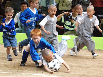 圖文:韓國小和尚比試腳法 “是否少林足球?” 2002年05月15日 10:18 ![]() 隨著世界杯的臨近,各地都在舉行豐富多彩的活動。14日漢城曹溪寺的童子和尚們與駐韓美國孩子們一起進(jìn)行了一場別開生面的友誼賽。圖為,一童子尚由于過于快速帶球,一不小心跌倒在地。(據(jù)《中央日報》)