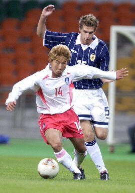 4-1完美屠戮蘇格蘭隊(duì) 太極虎韓國熱身也瘋狂(圖) 2002年05月16日 22:21 ![]() 李天秀為韓國隊(duì)敲開勝利之門 中新網(wǎng)漢城5月16日消息:在剛剛結(jié)束的一場(chǎng)世界杯熱身比賽中,東道主之一的韓國主場(chǎng)發(fā)揮神勇,以4-1完美“屠殺”了前德國國家隊(duì)主教練福格茨執(zhí)教的蘇格蘭隊(duì),從而完成了6場(chǎng)熱身不敗。其中李天秀成為場(chǎng)上最耀眼的明星,他的第一個(gè)進(jìn)球堪稱世界級(jí),而安貞煥則梅開二度。韓國隊(duì)的另外一個(gè)入球由尹晶煥完成,蘇格蘭隊(duì)由首次入選國家隊(duì)的多比打入一粒安慰性入球。 蘇格蘭由于沖擊世界杯失利,球隊(duì)面臨著重組。在福格茨上任后在上個(gè)月的第一場(chǎng)國家隊(duì)比賽中,就以0-5慘敗給法國隊(duì)。在與韓國隊(duì)的比賽中,由于多名主力因傷缺陣,因此球隊(duì)的實(shí)力又打了折扣。 比賽的僵局在第15分鐘就打破,號(hào)稱韓國“天才新秀”的李天秀得到后場(chǎng)長傳后,利用嫻熟的個(gè)人技術(shù)盤過了幾名防守隊(duì)員后,又帶球過了門將,在對(duì)方最后一名后衛(wèi)的干擾下,冷靜的將球鏟射入網(wǎng)。 一球領(lǐng)先的韓國隊(duì)得勢(shì)不饒人,四分鐘之后,李天秀在左邊的射門稍稍偏出。隨后,李榮杓傳球給黃善洪,對(duì)方門將在撲了一下后球險(xiǎn)些滾入大門。相對(duì)而言,蘇格蘭則顯得沒有多少機(jī)會(huì)。 下半場(chǎng)希丁克用在意大利佩魯賈俱樂部效力的安貞煥換下了老將黃善洪。安貞煥很快就表現(xiàn)出過人的實(shí)力,他在第57分鐘一腳有力的遠(yuǎn)射將球打進(jìn)。第67分鐘,同樣替補(bǔ)上場(chǎng)的中場(chǎng)尹晶煥同樣在禁區(qū)外抽射,將比分?jǐn)U大為3比0。第74分鐘,卡首次出場(chǎng)的蘇格蘭前鋒多比接隊(duì)友開出的任意球,頭球攻門得手。補(bǔ)時(shí)階段,安貞煥以一記精準(zhǔn)的挑射再下一城。 在隨后的比賽中,韓國還將與英格蘭和法國隊(duì)進(jìn)行熱身。(宋方燦)