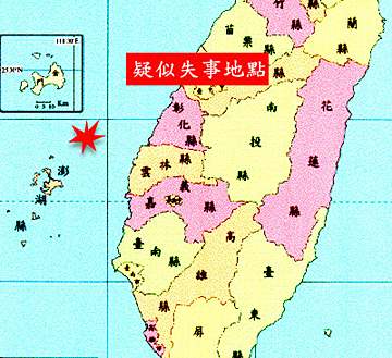 圖:臺(tái)灣墜?蜋C(jī)墜海地點(diǎn)示意圖 2002年05月25日 19:06 ![]() (中時(shí)電子報(bào)圖) 鄭重聲明:關(guān)于臺(tái)灣華航飛機(jī)失事的新聞信息,系中新網(wǎng)特稿,未經(jīng)書面授權(quán),不得采用。