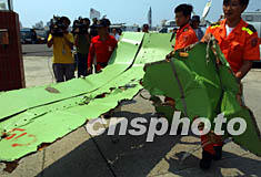 圖:打撈出的華航客機(jī)殘骸 2002年05月26日 16:24 ![]() 5月26日下午,搜索人員打撈出失事華航客機(jī)部分殘骸。中新社記者 任晨鳴 攝