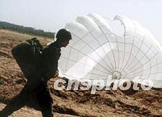 圖:空降新兵跳傘訓(xùn)練 2002年05月26日 18:28 ![]() 中國某空降部隊新兵,在五月的驕陽下進(jìn)行跳傘訓(xùn)練,一位新兵收傘后急速通過同伴的降點(diǎn)準(zhǔn)備下一次跳傘。因為跳點(diǎn)準(zhǔn)確、收傘快速是他們當(dāng)前訓(xùn)練的主要目標(biāo)。王麗南 攝