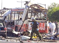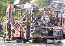 耶路撒冷市中心公共汽車爆炸案已有18人死亡(圖) 2002年06月18日 15:29 ![]() ![]() 被襲擊的公共汽車 中新網(wǎng)北京6月18日消息:以色列電視二臺(tái)18日?qǐng)?bào)道說,耶路撒冷市中心當(dāng)日上午發(fā)生公共汽車自殺炸彈襲擊事件,造成17人死亡。 報(bào)道沒有說明死亡人數(shù)中是否包括自殺炸彈襲擊者本人。這起自殺性炸彈襲擊還造成車上32人受傷。 這輛公共汽車從耶路撒冷南郊的吉羅猶太人區(qū)開往市中心,當(dāng)時(shí)正是交通高峰時(shí)段。 阿克薩烈士旅宣稱對(duì)耶路撒冷公汽爆炸案負(fù)責(zé) 中新網(wǎng)北京6月18日消息:黎巴嫩真主黨游擊隊(duì)的電視臺(tái)18日接到匿名電話,此人聲稱“阿克薩烈士旅”對(duì)耶路撒冷爆炸案負(fù)責(zé)。 德新社援引該電視臺(tái)的報(bào)道說,這次炸彈襲擊是為了“阿克薩烈士旅”在伯利恒的領(lǐng)導(dǎo)人蘇布赫17日被殺而進(jìn)行的報(bào)復(fù)。 耶路撒冷南部18日交通高峰時(shí)段發(fā)生公共汽車爆炸案,造成13人死亡,40人受傷,其中5人情況危急。 哈馬斯組織也聲稱對(duì)耶路撒冷公汽爆炸案負(fù)責(zé) 中新網(wǎng)北京6月18日消息:巴勒斯坦激進(jìn)的“伊斯蘭抵抗運(yùn)動(dòng)”(哈馬斯組織)18日宣稱對(duì)耶路撒冷公共汽車爆炸案負(fù)責(zé)。 有人給法新社打去匿名電話,聲稱哈馬斯組織的軍事派別“卡薩姆旅”實(shí)施了這次行動(dòng)。 另?yè)?jù)報(bào)道,黎巴嫩真主黨游擊隊(duì)的電視臺(tái)也接到匿名電話,此人聲稱“阿克薩烈士旅”對(duì)耶路撒冷爆炸案負(fù)責(zé)。 耶路撒冷市中心18日交通高峰時(shí)段發(fā)生公共汽車爆炸案,造成17人死亡,約30人受傷。 沙龍親臨耶路撒冷爆炸現(xiàn)場(chǎng)拒談巴勒斯坦建國(guó) 中新網(wǎng)北京6月18日消息:在耶路撒冷市中心發(fā)生造成17人死亡的公汽爆炸案后,以色列總理沙龍18日拒絕巴勒斯坦建國(guó)。 據(jù)法新社報(bào)道,沙龍?jiān)谑掳l(fā)現(xiàn)場(chǎng)對(duì)記者表示:“你還能談什么巴勒斯坦國(guó)家!边@是沙龍出任總理以來首次親往巴勒斯坦人自殺炸彈襲擊現(xiàn)場(chǎng)視察。 沙龍?jiān)跀?shù)十名警察和保鏢的簇?fù)硐卤硎荆骸拔覀兘裉煲姷降氖前屠账固箍植乐髁x,我們必須打擊這種恐怖主義,這也正是我們?cè)谧龅摹!?/p> 美國(guó)官員最近提出建立臨時(shí)的巴勒斯坦國(guó)家的構(gòu)想,并通過談判確定其最終的形式。 18日的自殺性炸彈襲擊發(fā)生之際,美國(guó)總統(tǒng)布什正準(zhǔn)備宣布其中東和平新戰(zhàn)略。 耶路撒冷公汽爆炸案造成18名以色列人死亡 中新網(wǎng)北京6月18日消息:18日在耶路撒冷市中心,一名巴勒斯坦人在公共汽車上引爆炸彈,造成18名以色列人死亡,其中包括一些學(xué)童。 據(jù)法新社報(bào)道,醫(yī)院官員透露說,48名傷者正在接受治療,其中包括數(shù)名年齡在10到12歲之間的兒童。 報(bào)道還說,一名婦女在入院后不久就不治身亡,另外還有6名傷者的傷勢(shì)嚴(yán)重。 相關(guān)報(bào)道:耶路撒冷南部發(fā)生公車爆炸 13人死亡40人受傷