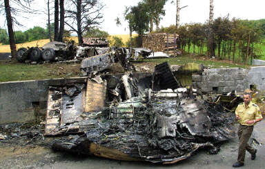 圖文:一警官從墜毀的圖-154殘骸前經(jīng)過 2002年07月03日 14:30 德國當(dāng)?shù)貢r間7月1日夜(北京時間2日晨),一架DHL公司的波音757貨機和俄羅斯巴什基爾航空公司的圖-154客機在德國巴登-符騰堡州于伯林根鎮(zhèn)上空相撞并墜毀,造成71人死亡,其中包括52名兒童。圖為一名警官從墜毀的圖-154殘骸前經(jīng)過。(春風(fēng))