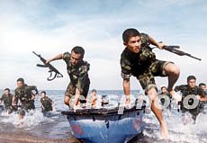 圖:解放軍沖鋒舟武裝搶灘登陸演習(xí) 2002年08月03日 17:28 ![]() 沈陽軍區(qū)官兵今夏在東北某海域進(jìn)行水上多項軍事課目訓(xùn)練,演習(xí)武裝搶灘登陸,向既定目標(biāo)快速挺進(jìn)。作者:馬檣