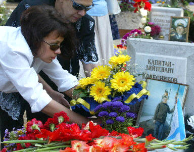 圖:莫斯科紀(jì)念"庫爾斯克號(hào)"核潛艇失事兩周年 2002年08月12日 22:36 ![]() 俄羅斯首都莫斯科12日舉行“庫爾斯克號(hào)”核潛艇失事兩周年紀(jì)念儀式,為118名死難者而設(shè)的紀(jì)念碑在莫斯科揭幕,幾十名海員及遇難者親友沉痛悼念葬身大海的海軍官兵。圖為遇難者家屬在紀(jì)念碑前擺放鮮花。