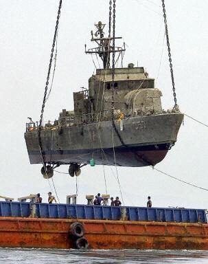 據(jù)韓國(guó)聯(lián)合通訊社報(bào)道,韓國(guó)海軍海難援救隊(duì)今天利用大型海上吊車(chē),成功地將24-27米海底深處的沉沒(méi)艦艇起吊到一艘駁船上。這艘艦艇將被運(yùn)到平澤第2艦隊(duì)司令部基地接受船體檢查。