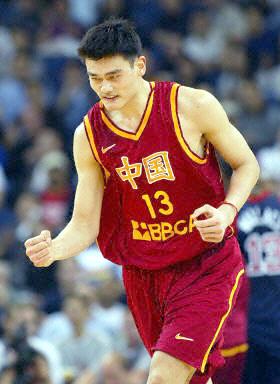 今天正進行的一場美國夢五隊與中國男籃的熱身賽上,姚明為中國隊先得兩分。圖為姚明進球后握緊拳頭。