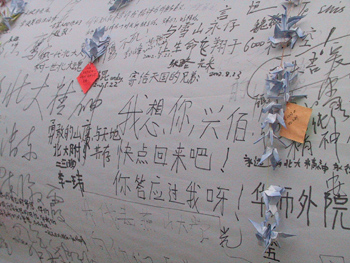 為了紀(jì)念這五位遇難同學(xué),北京大學(xué)還在百周年紀(jì)念講堂東廳設(shè)立了靈堂,北京大學(xué)黨委書(shū)記閔維方、校長(zhǎng)許智宏等人于今天下午四點(diǎn)前往哀悼。山鷹社平日訓(xùn)練的人工巖壁前也成了祭奠的場(chǎng)所,人們?cè)谀抢飻[放花束、花圈,寄托哀悼之情。