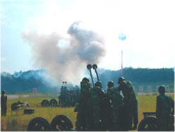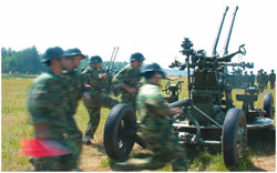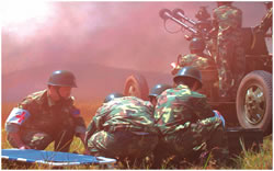 演習(xí)剛剛開始,一隊(duì)民兵在我高炮陣地附近忙碌著,他們很快設(shè)立了一個(gè)高炮陣地,原來他們是用報(bào)廢的高炮設(shè)置了一個(gè)假高炮陣地以迷惑來襲之“敵”。與此同時(shí),另一隊(duì)民兵在旁邊給一枚導(dǎo)彈模型充氣,不到一分鐘,這枚同樣是用于迷惑“敵人”的地空導(dǎo)彈便豎立起來。
