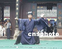 來自武當(dāng)派的英杰,由原太和宮主持、武當(dāng)?shù)澜涛幕芯繒䲡L游玄德宗師掌門率隊(duì)。武當(dāng)派高手袁理敏、游小龍、游尊龍、周理參、黃理安等赴賽。著一身道服,頭戴莊子帽的游玄德在臺上將武當(dāng)秘傳太極拳和神秘的內(nèi)家功夫?qū)崙?zhàn)演藝首次公開亮相,幾個(gè)招式,便贏得滿場喝彩。武當(dāng)派內(nèi)家祖庭十五代弟子游小龍的武當(dāng)醉八仙劍,演示得似醉非醉、云里霧里、劍法凌厲多變。