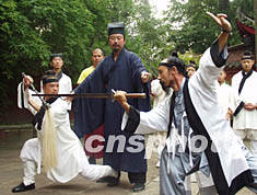 中國少林、武當(dāng)、峨眉三大門派的武林高手百余人在報(bào)國寺寺門外擺開擂臺,一展各派絕技。