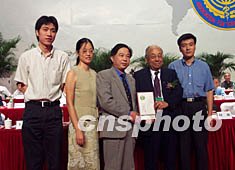 楊煥明、汪建、于軍等七人因完成水稻基因組和建立中國基因組分析基地作出杰出貢獻而獲得了2002年求是"杰出科技成就集體獎"。圖為香港知名人士、實業(yè)家查濟民先生(右二)在中國科協(xié)學(xué)術(shù)年會上為獲獎?wù)哳C獎。作者:陳雯