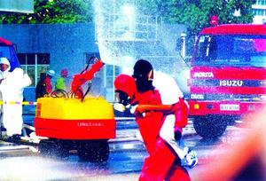 很快,消防隊員確定出染毒區(qū)和警戒區(qū),警戒哨兵立即站到崗上,阻止車輛、人員進入染毒區(qū)域,防止二次染毒。不同類型的洗消帳篷被迅速充氣建起,中毒人員被送入其中進行洗消、救治。大水罐車噴射霧狀水流和水幕,稀釋降毒,防止毒氣向安全區(qū)擴散,掩護現(xiàn)場救援。
