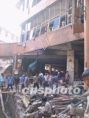 記者今天在現(xiàn)場了解到,發(fā)生爆炸的地方不僅僅只是農(nóng)貿(mào)市場,還有與市場相鄰的長江橡膠廠等地區(qū),甚至一家與農(nóng)貿(mào)市場相隔一條大馬路的餐館亦未能幸免,這家餐館目前已面目全非,窗戶及墻上的玻璃已全部震碎。