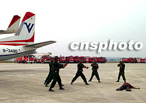 演練在下午二點十分開始:一架由廣州飛往綿陽的運(yùn)七航班飛機(jī)被兩名“歹徒”劫持,機(jī)上共有乘客五十名。一名持刀“歹徒”挾持婦女為人質(zhì),另一“歹徒”聲稱攜帶有炸彈,索要人民幣二百萬元。當(dāng)?shù)毓矙C(jī)關(guān)接到報警后,馬上采取了緊急救援程序。武警、巡警、刑警、消防等相關(guān)部門近千名警員、近百輛警車和特種車輛,在二十分鐘內(nèi)集結(jié)到位,對機(jī)場進(jìn)行了封鎖和控制。
