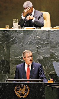 在布什講話之前﹐聯(lián)合國秘書長安南在致詞時強調(diào)﹐在國際事務(wù)上必須尋求多邊原則﹐而且必須按照原則辦事。他還不點名地批評美國說﹐在國內(nèi)講法治的國家在國際事務(wù)中也應(yīng)依法辦事。他在談到國際社會面臨的四大威脅時﹐首先指出的是中東地區(qū)的巴以沖突﹐其次才是伊拉克﹐接下來是阿富汗﹐最后是南亞地區(qū)的印巴沖突。