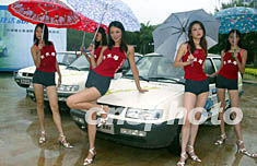 中國首批柴油轎車--捷達(dá)柴油環(huán)保轎車二十日在海南三亞舉行向市場投放儀式,新絲路模特大賽女選手雨中演出環(huán)保秀。環(huán)境優(yōu)美的三亞市率先在國內(nèi)推廣柴油環(huán)保轎車,以進(jìn)一步保護(hù)環(huán)境。作者:毛建軍