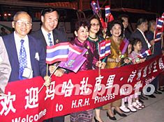 專程從泰王國飛抵?谟釉娏胀ü鞯囊话俣嗝﹪D相l(xiāng)親,在機場拉起了寫著泰文與中文的橫幅,揮舞著中國、泰國國旗,在十五的滿月下笑迎詩琳通公主。