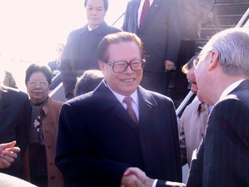 中美兩國(guó)為江澤民此次訪美作了大量準(zhǔn)備工作。今天,當(dāng)江澤民的專機(jī)降落在芝加哥奧海爾國(guó)際機(jī)場(chǎng)時(shí),受到了芝加哥市市長(zhǎng)戴利和夫人、伊利諾伊州副州長(zhǎng)本豪森、美國(guó)駐華大使雷德以及當(dāng)?shù)厝A僑華人、留學(xué)生代表的熱烈歡迎。