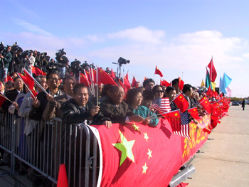中資機(jī)構(gòu)和當(dāng)?shù)厝A人華僑、留學(xué)生代表數(shù)百人到機(jī)場(chǎng)歡迎江主席一行 中新社記者 呂振亞 攝
