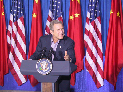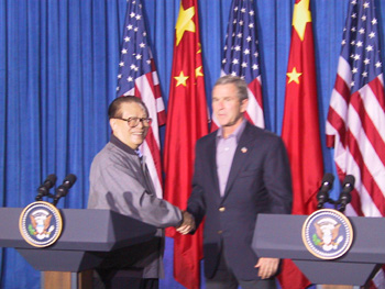 江澤民說,今天我和布什總統(tǒng)也談到了朝鮮核問題,我們有一個共同的愿望,希望這一問題能得到和平解決。