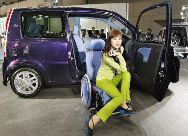 10月29日,在東京汽車展覽會新聞預展會上,模特展示新型概念車。圖為一款為方便輪椅上下車設計的新型車。