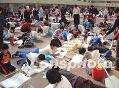 迎接“十六大”現(xiàn)場中小學(xué)生書法比賽在珠海舉行,共有五百名中、小學(xué)生參加。作者:石頭