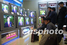 十五日上午,在北京甘家口大廈購物的市民聚集在電視前,觀看中共十六大新當(dāng)選的政治局常委的首次集體亮相。作者:史利