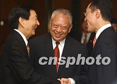 在香港出席世界會計師大會的中國國務(wù)院總理朱镕基,11月19日在會見香港特首董建華的特設(shè)國際顧問時與董建華和香港工商及科技局局長唐英年交談。任晨鳴 攝