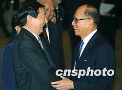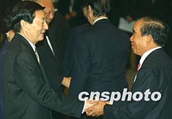 中國國務(wù)院總理朱镕基和夫人勞安,11月19日下午在香港會見中資機(jī)構(gòu)的諸位“老板”,香港特首董建華和夫人陪同會見。中新社傳真任晨鳴攝