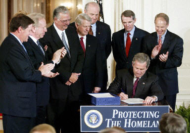 “九·一一”事件之后,布什一直積極游說國會議員通過成立國土安全部的法案。該機構(gòu)的成立,正式啟動了50多年來最大規(guī)模的政府改組計劃。布什在簽字儀式上將法案的簽署稱為“歷史性的行動”,并說這項法案將使美國能夠更加協(xié)調(diào)和有效地對付恐怖襲擊威脅!