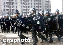 身穿最新式防暴盔甲服、手拿盾牌的防暴隊(duì)員演習(xí)架設(shè)盾牌防護(hù)墻,準(zhǔn)備在A國(guó)駐蓉辦事處和鬧事人群之間形成隔離和警戒區(qū)。作者:劉真
